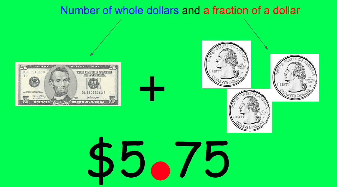 Example: $5.75 is five whole dollars and a fraction of a dollar;12.5 inches is 12 inches and a fraction of inches.